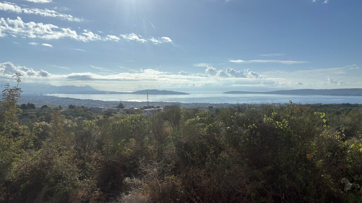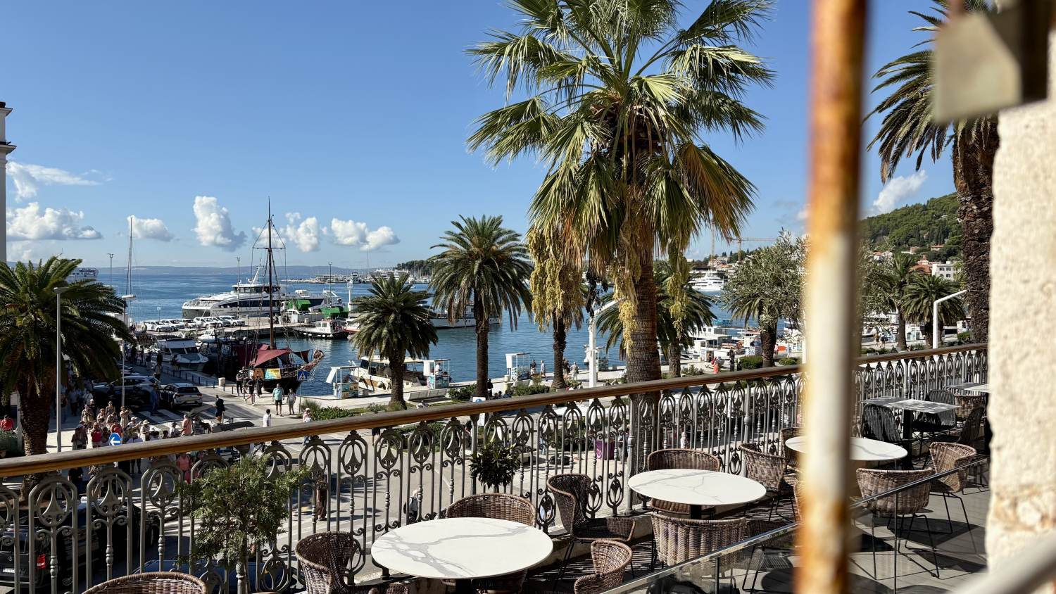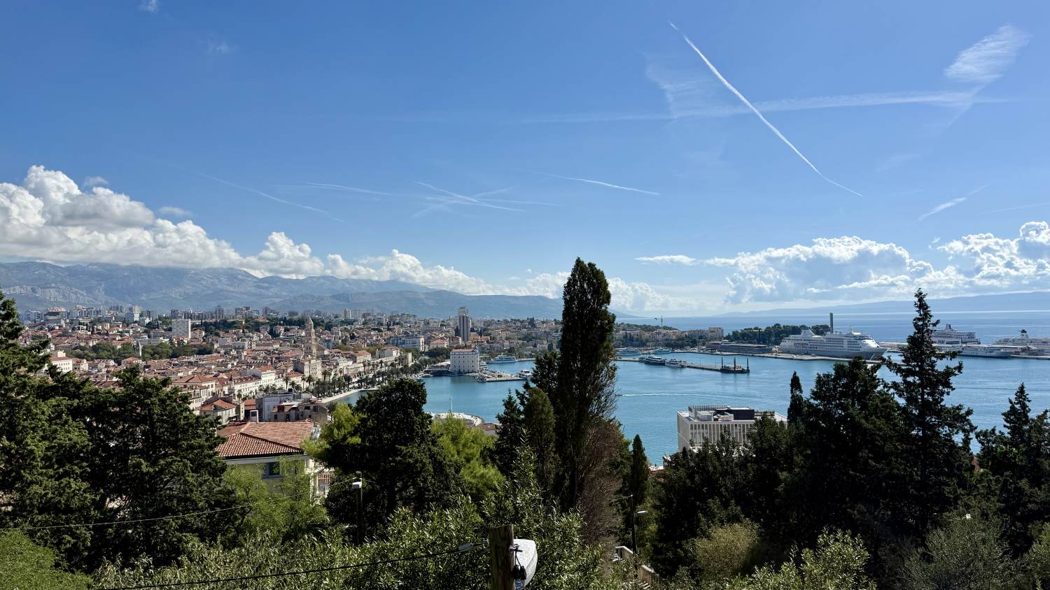 Auf der Teraca Vidilica richten wir uns für die nächsten Stunden häuslich ein, um ein paar Mails zu erledigen — bei kühlen Getränken und herrlichem Blick über Split und die Küste lässt es sich gut aushalten.