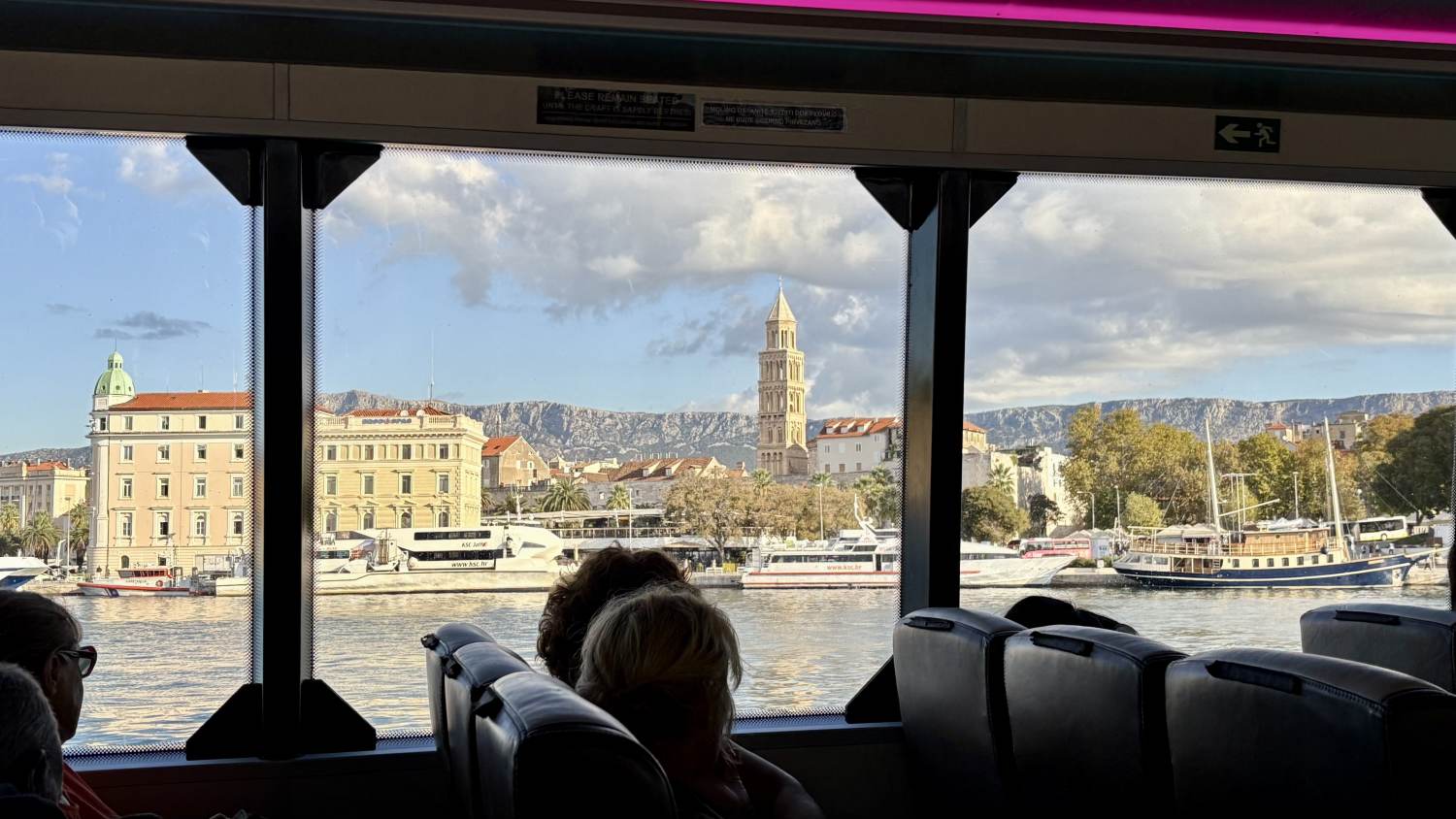 Am Hafen erwartet uns ein Katamaran — von außen immer recht eindrucksvoll, aber für uns Passagiere heißt das leider, dass man wie im Flugzeug auf festen Sitzen „eingesperrt” ist, ohne Außenbereich.