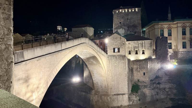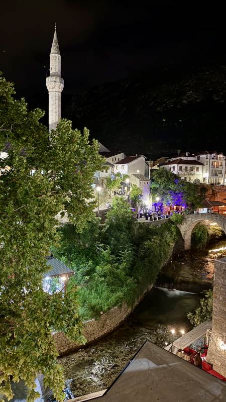 Vom Busbahnhof sind es ca. 20 Minuten Fußweg zu unserem Hotel, das direkt in der Fußgängerzone hinter der berühmten wiederaufgebauten Alten Brücke (Stari Most) liegt.