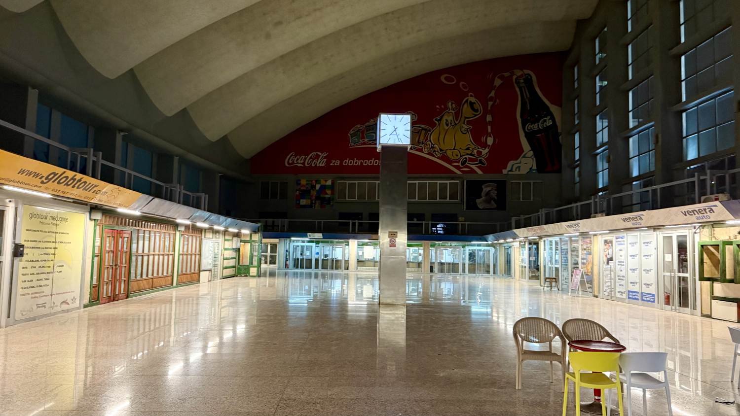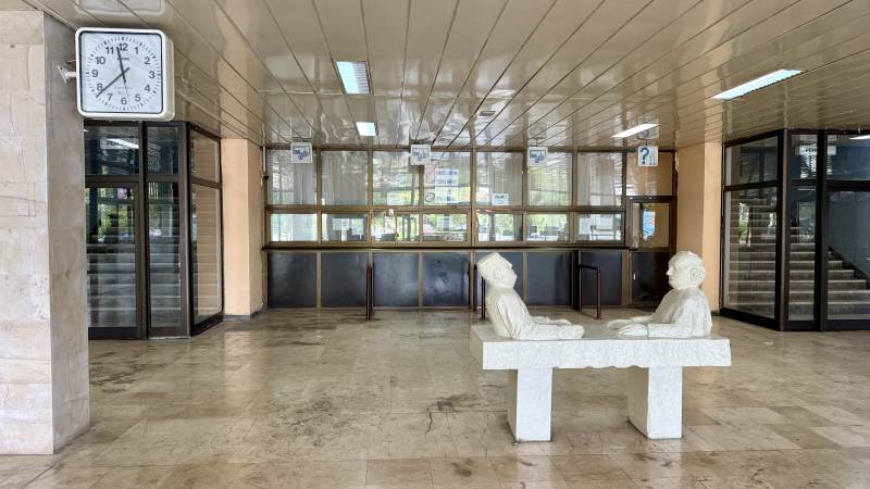 Das Bahnhofsgebäude ist so riesig und dominant wie das Angebot darin minimalistisch bis nicht existent. Abgesehen von einem gerade nicht besetzten Ticketschalter (Pause) gibt es düstere, heruntergekommene Bahnhofscafés und sonst gar nichts. Immerhin entdecken wir einen Zettel, auf dem 17:09 Uhr als Abfahrtzeit zu entziffern ist …