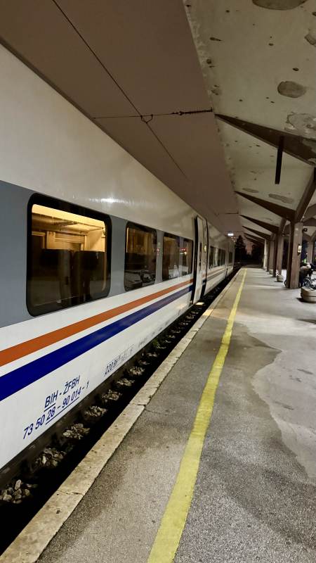 Der Zug selbst ist dann immerhin ein einigermaßen moderner Talgo, wobei die digitalen Anzeigen außer Funktion sind. Dank dem Man in Seat 61 (seat61.com) wissen wir, dass man auf der Strecke von Mostar nach Sarajewo rechts sitzen sollte, und trotz recht großem Andrang erobern wir auch passende Plätze.