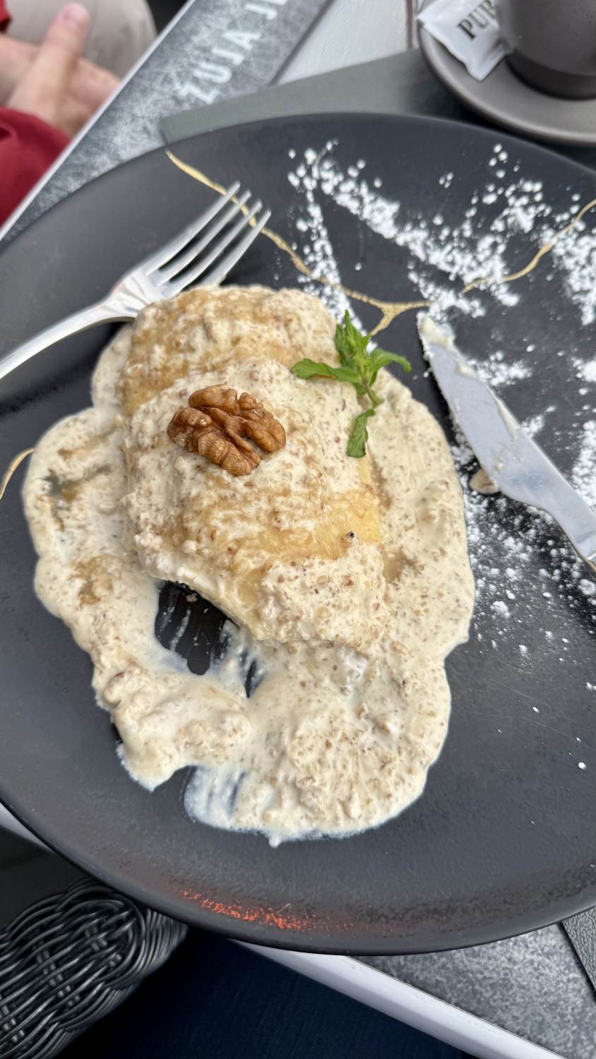 Danach zieht es uns in ein Café, wo wir zum Abschluss noch den von unserem Tour Guide gerühmten Štrukli probieren, einen mit speziellem Käse gefüllten und mit Honig beträufelten Strudel. Ist aber irgendwie nicht so unser Fall, alles etwas durchweicht. Aber vielleicht haben wir ja auch nur die falsche Version erwischt.