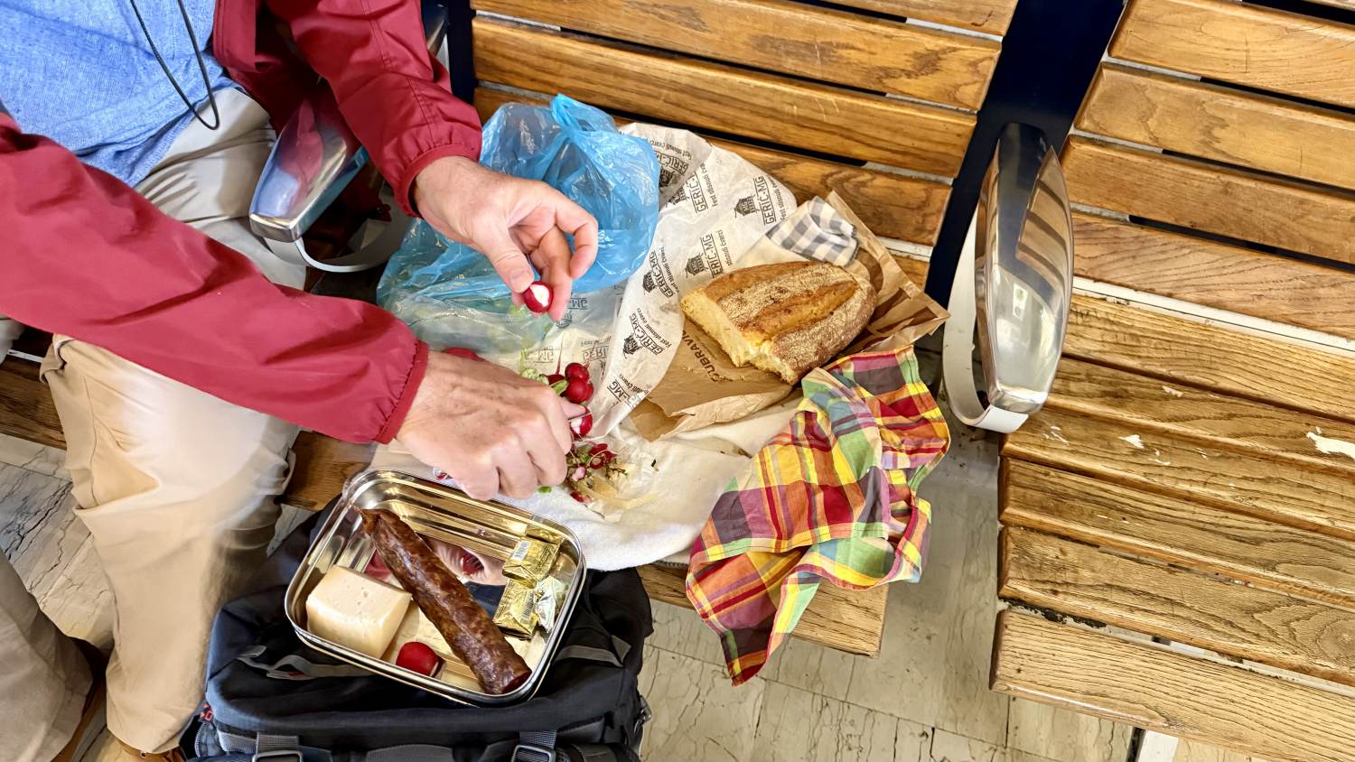 Anschließend geht es mit der Tram zum Hauptplatz und von dort zu Fuß zum großen Markt, auf dem wir Obst, Käse, Salami und Brot besorgen (und sogar kleine Butterpäckchen bekommen).