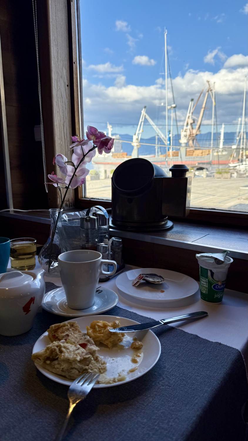 Das Frühstück auf dem Schiff mit Blick auf den Hafen hat was und stärkt uns ausreichend für die „Free Walking Tour”, die wir gebucht haben.