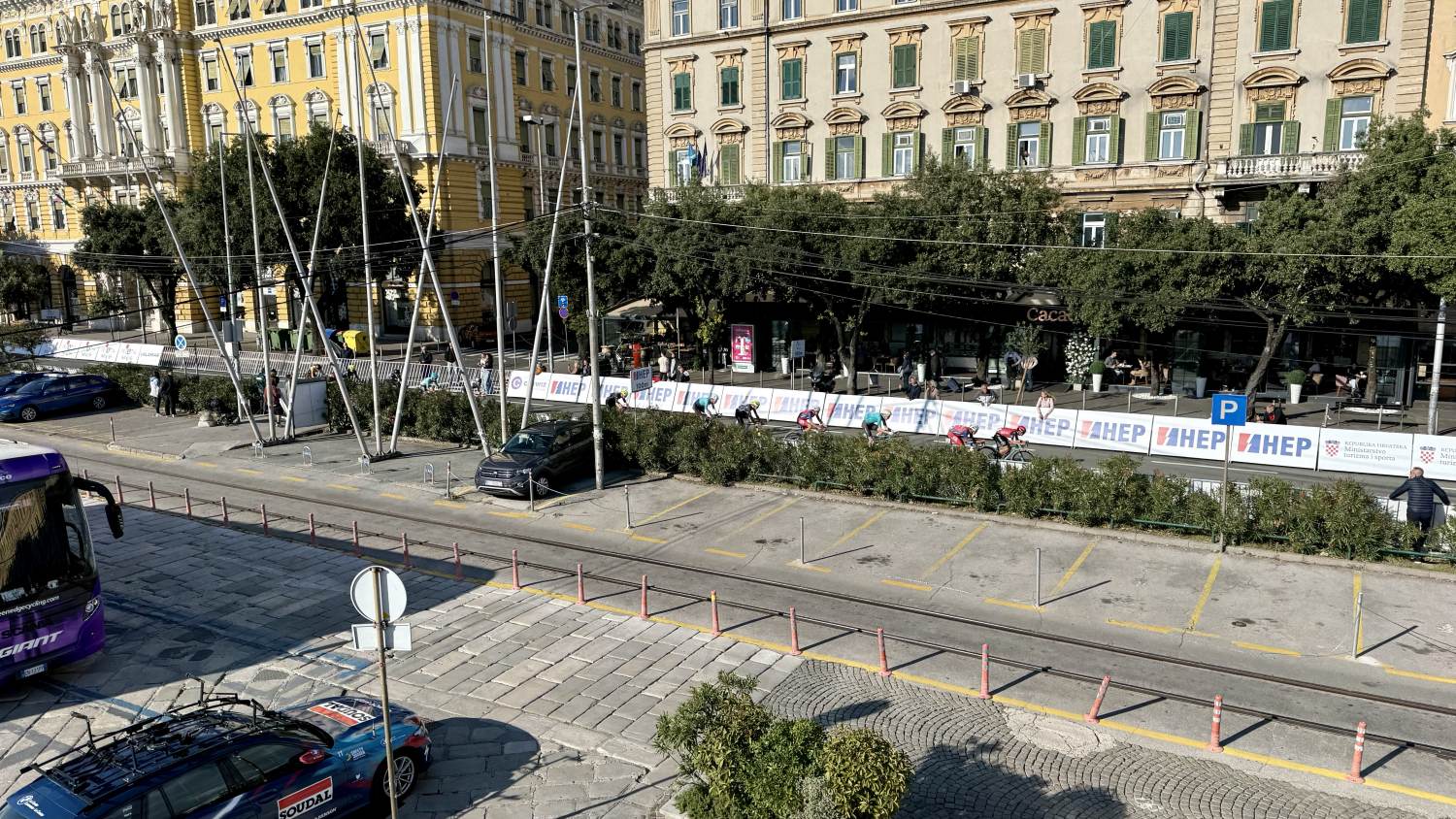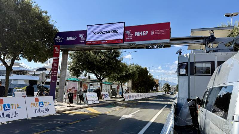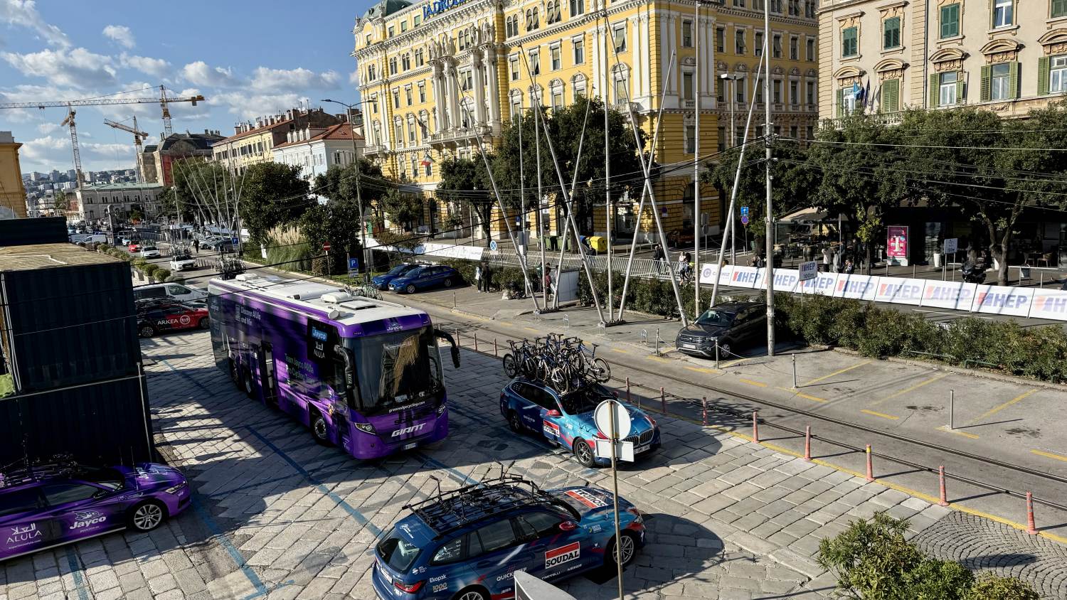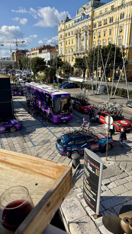 So sitzen wir ganz entspannt bis zum Zieleinlauf auf unserer Empore. Im Anschluss spazieren wir zum Ziel, vorbei an den Teamfahrzeugen mit all den edlen Gefährten auf dem Dach, und verfolgen die Siegerehrungen. Besser hätten wir es auch nicht hinkriegen können, wenn wir die Etappe bewusst hätten ansteuern wollen.